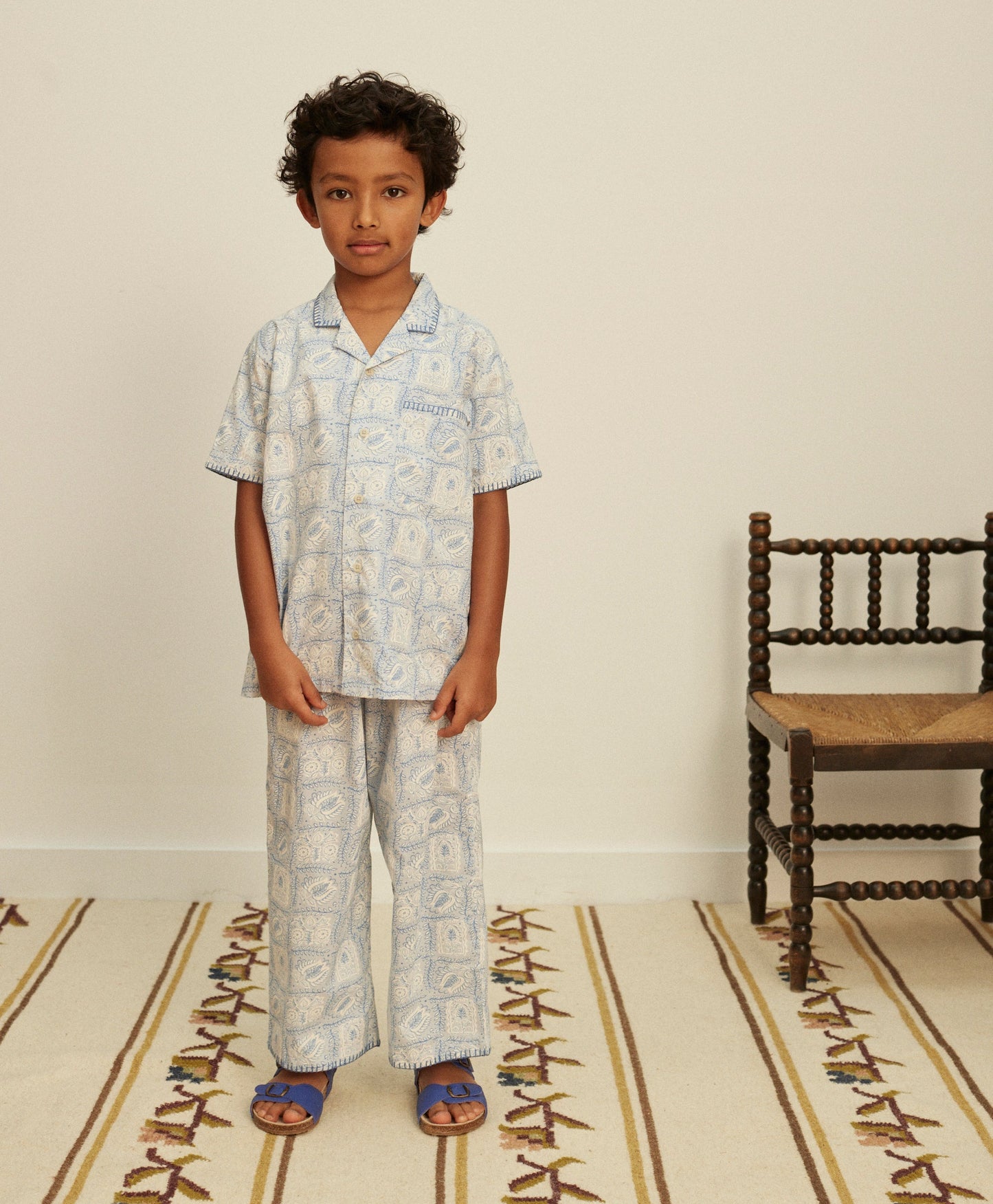 A casual unisex trouser set, Donny features a button through shirt with contrast blue blanket stitch at collar, sleeve and pocket, and an easy, loose fit trouser with adjustable elasticated waist. Crafted from our vintage-inspired ‘studio floral’ print cotton. We love Donny paired with sandals for a cool summer holiday mood.