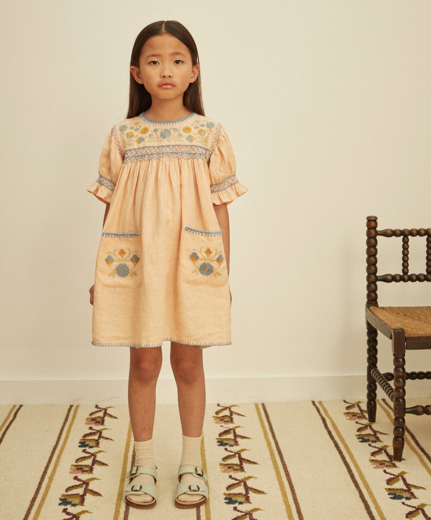 The delightful Dora dress comes in ‘satin pink’ linen. With classic yoke embroidery in the season’s pastel tones, contrast hand smocking at chest and puff sleeves, contrast crochet at neckline and pockets, and blanket stitch finish at hem. Invisible zip at closure at back.