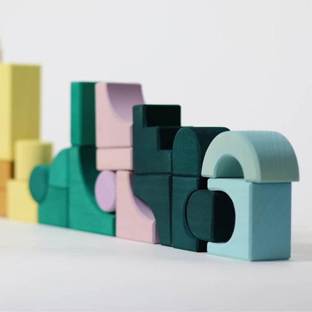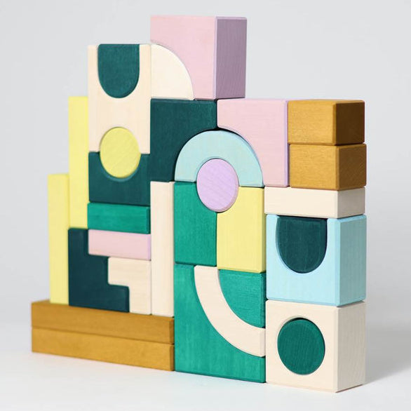 With its unexpected combination of shapes, MOVEMENT is an abstract construction set designed for experimental building. A few basic building blocks are complemented by unique pieces that surprise and inspire in every new combination.